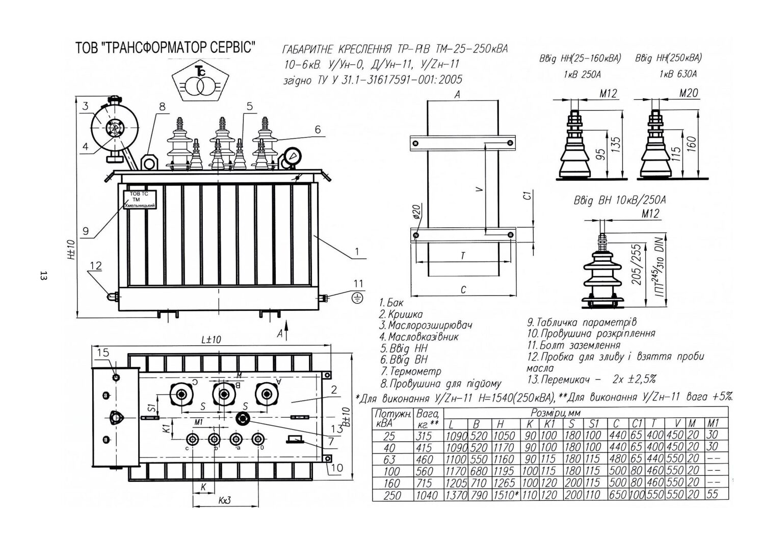 | ТМ-250/10-У1 | 1370 | 740 | 1600 | 1130 | 550 | 550 | 200 | 110 | 230 | 46 | 340 | 1150 |